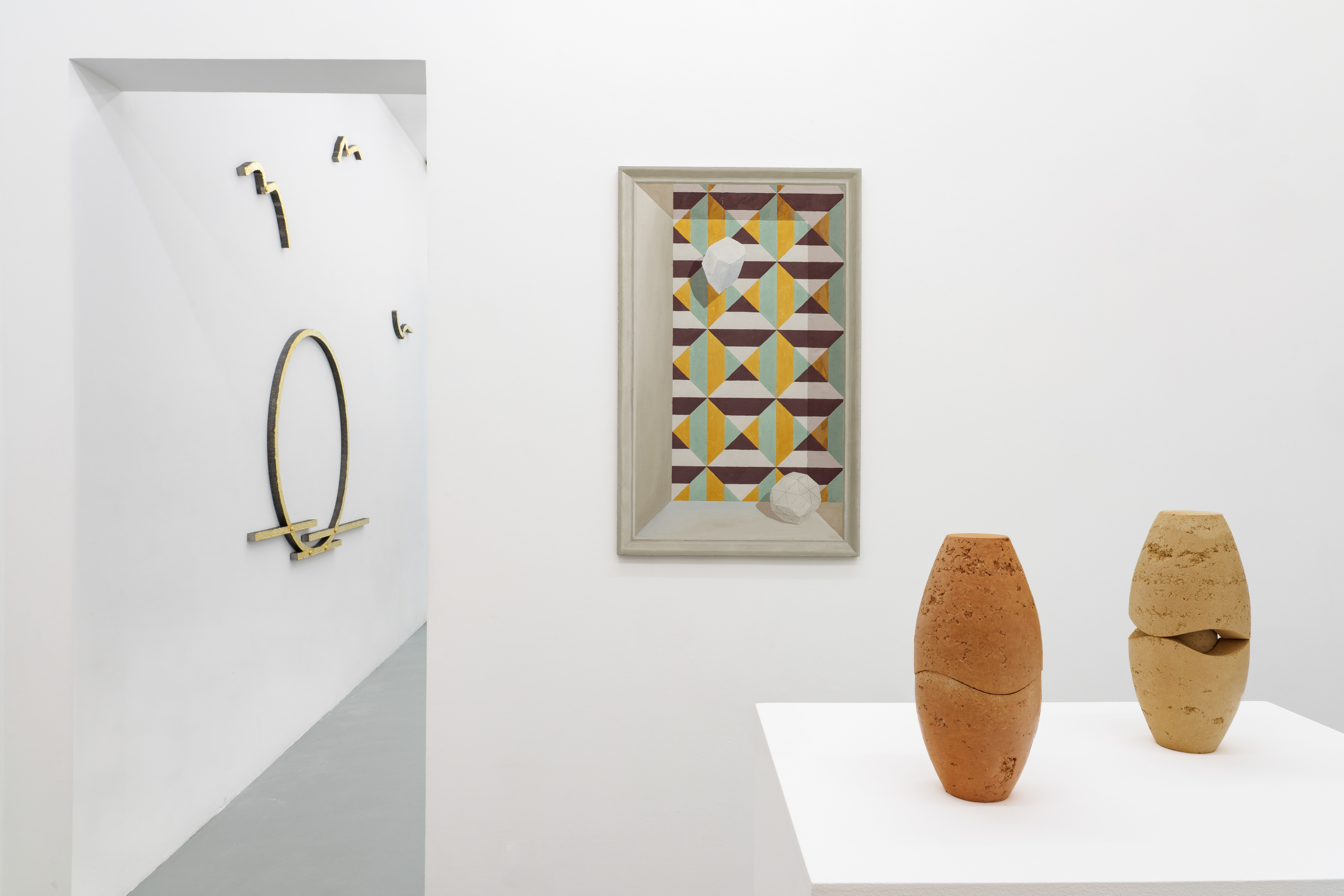 de gauche à droite, deux sculptures de amàco, Carole Calvez et Vincent Le Bourdon / elementos, une oeuvre de Sophie Whettnall, une oeuvre de Vincent Le Bourdon / elementos et Lucie Ponard